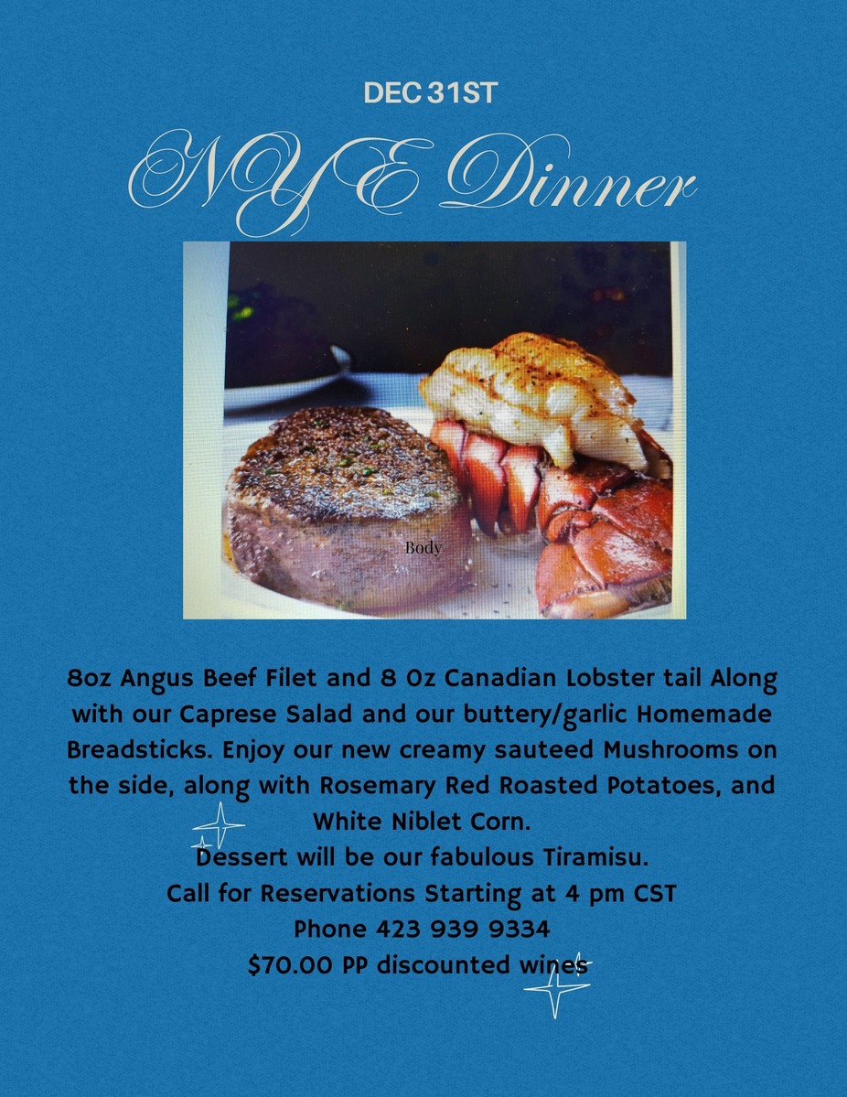 8oz Angus Beef Filet and 8 Oz Canadian Lobster tail, along with our Caprese Salad and our buttery/garlic Homemade Breadsticks. Enjoy our new creamy sauteed mushrooms on the side, along with Rosemary Red Roasted Potatoes, and White Niblet Corn. Dessert will be our fabulous Tiramisu. Call for Reservations Starting at 4 pm CST $70.00 PP discounted wines Phone (423) 939-9334